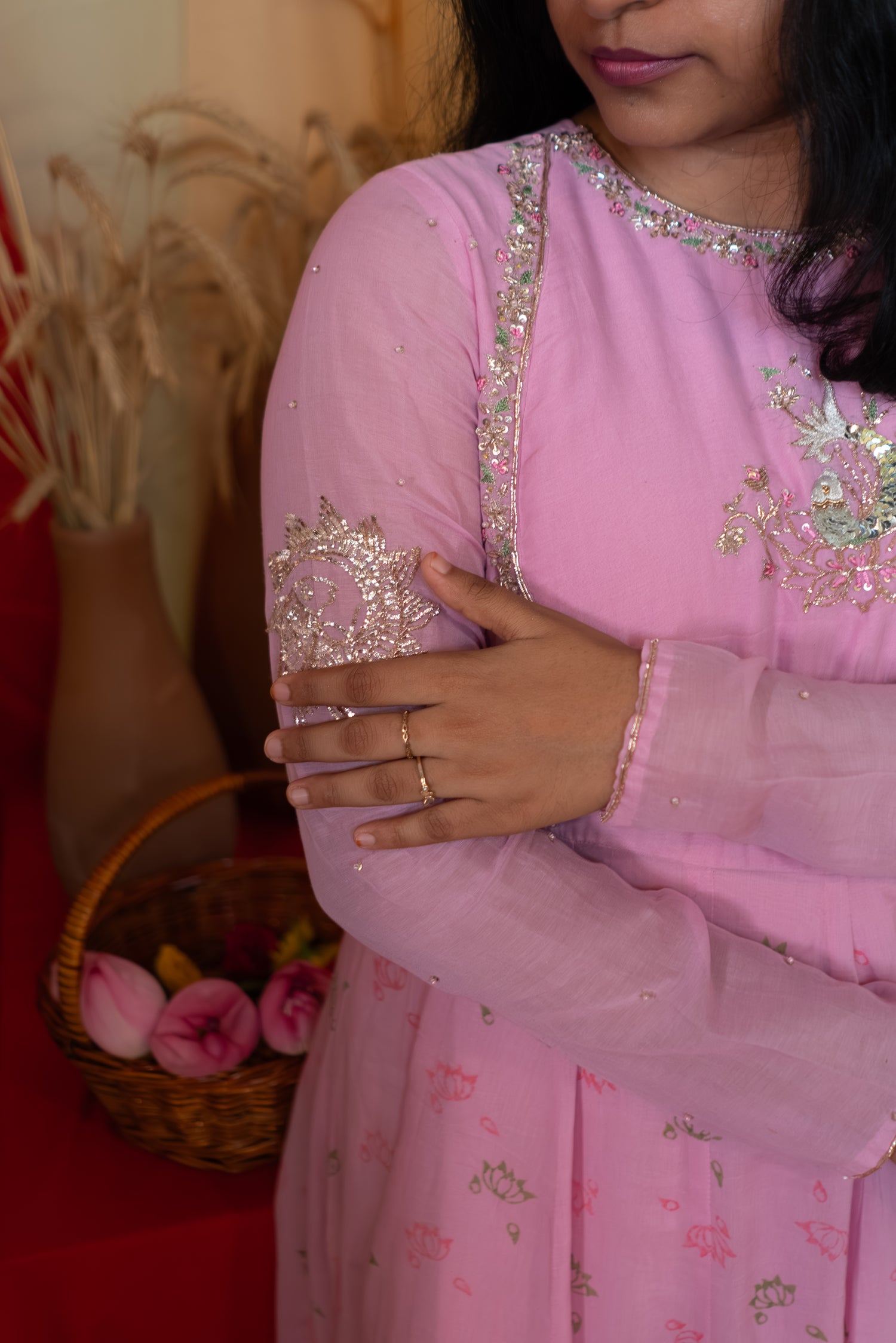 A blend of teal blue and terracotta brown, with pleated yoke detailing. Beautiful block printed accents on the Anarkali and the dupatta adds an elegant touch for the outfit.