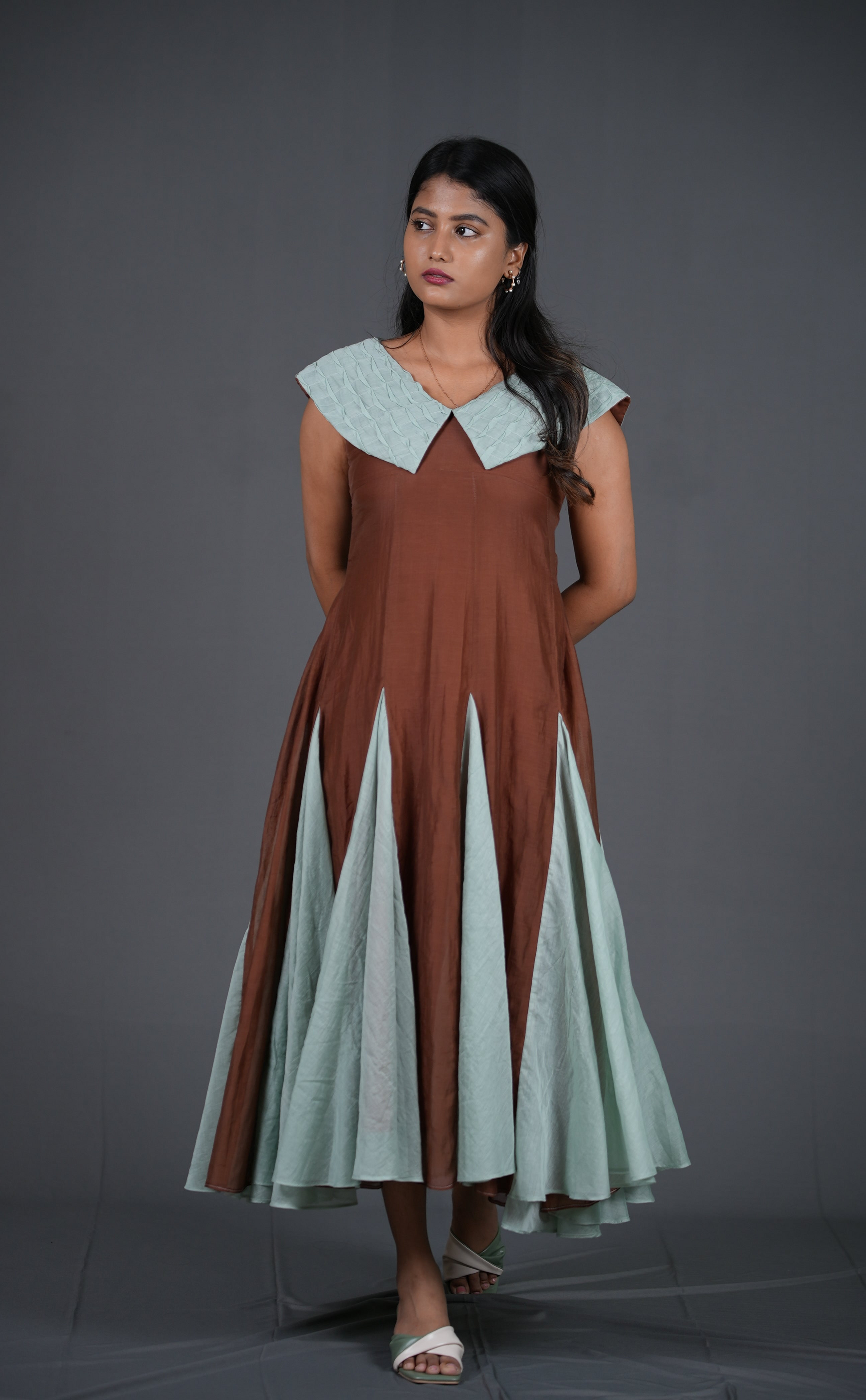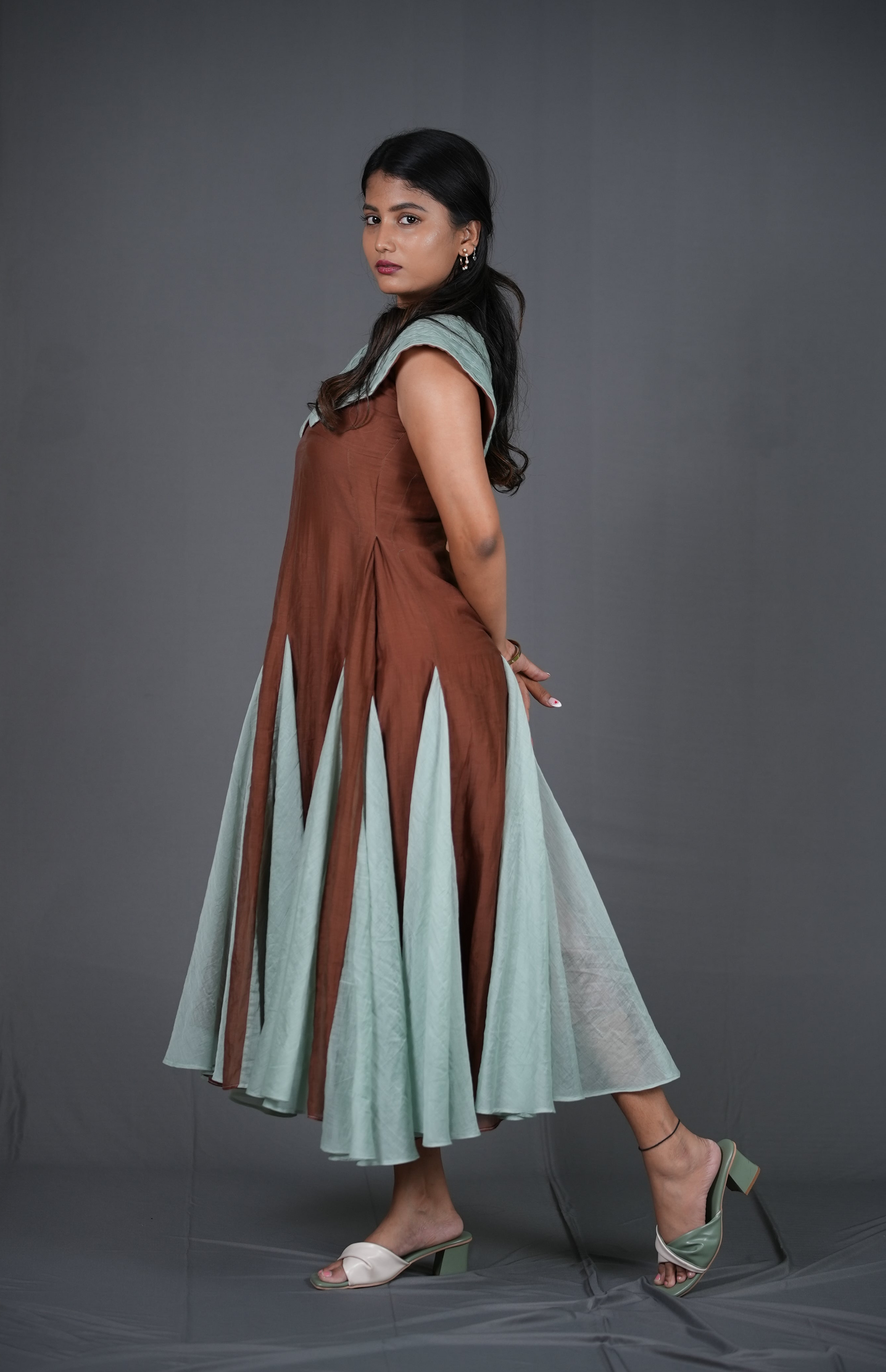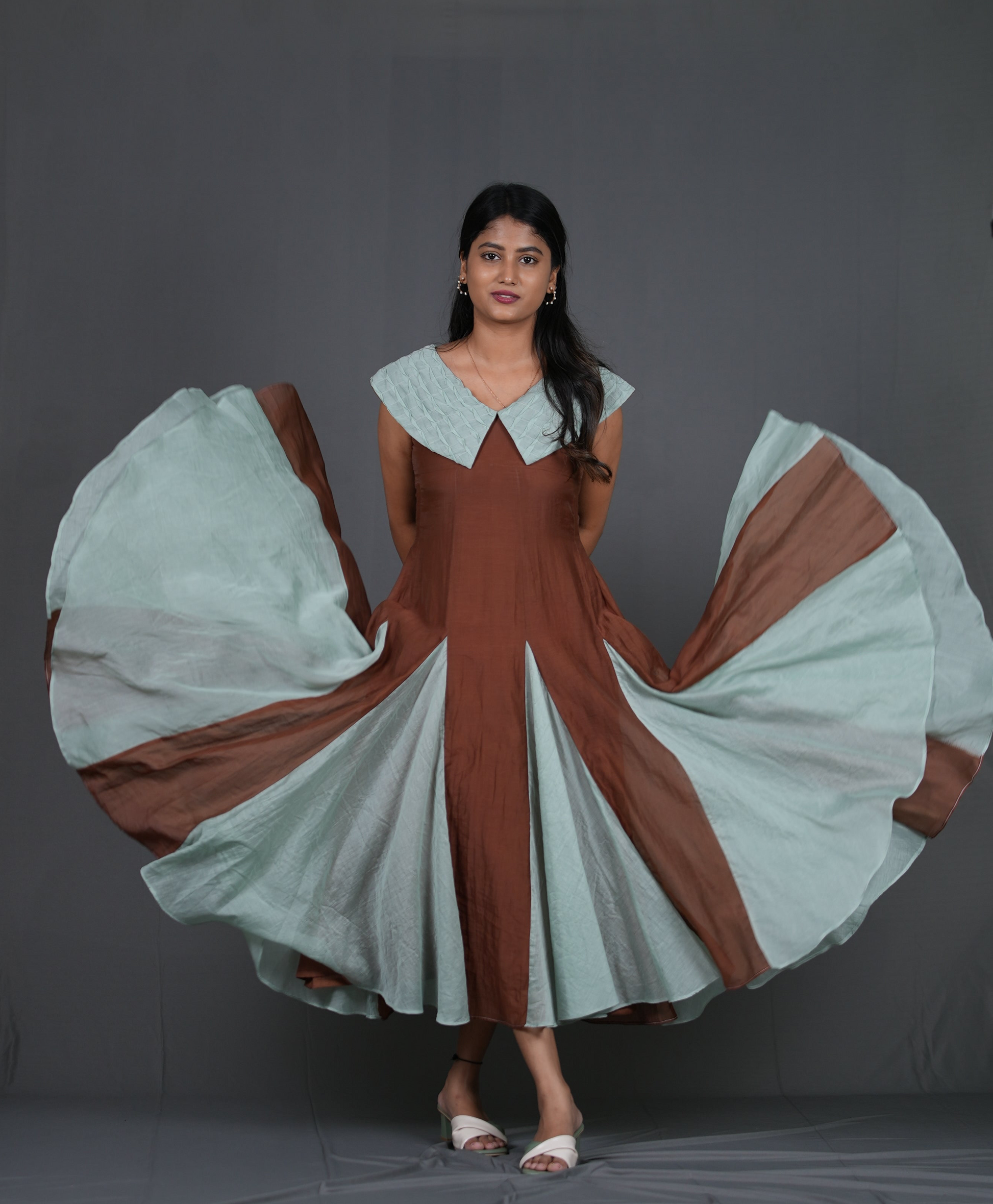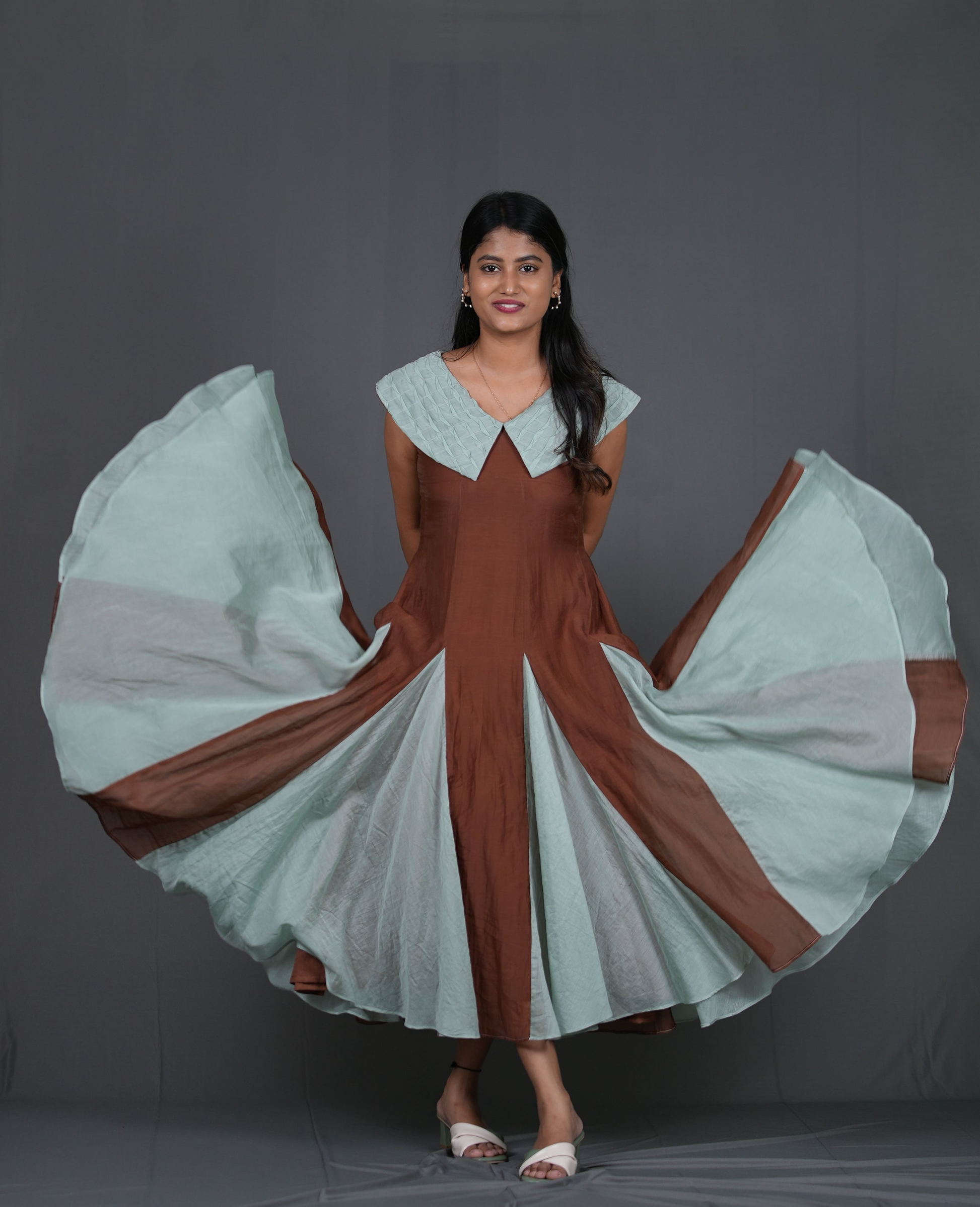 The Nira Dress is a dual-tone Chanderi silk silhouette,blending a soft sheen with a lightweight, airy feel. The design features coffee brown and dusty mint panels, creating a fluid, full circular flare that moves beautifully.