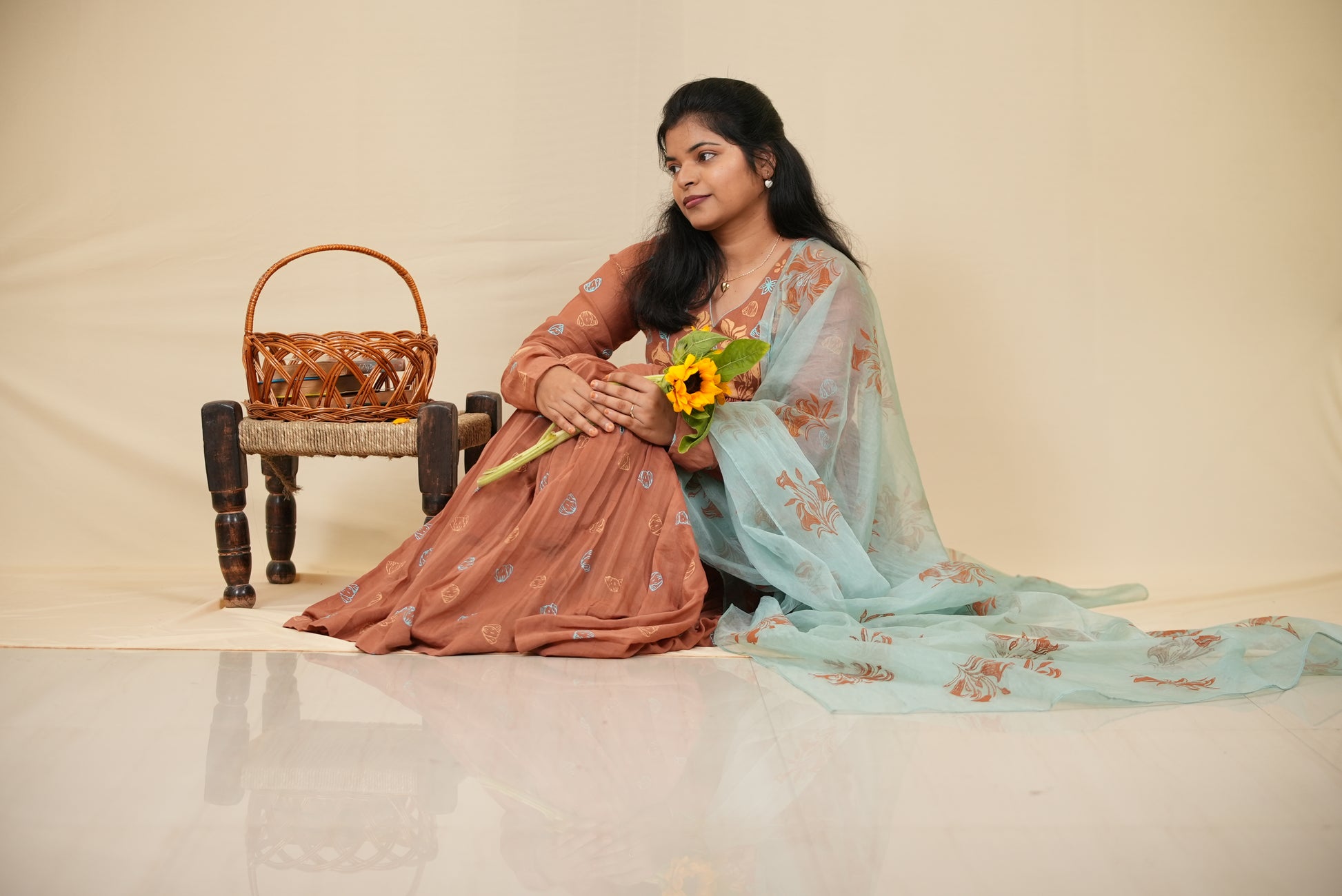 Paired with a dusty teal organza dupatta, also adorned with hand block-printed floral motifs, this ensemble balances earthy warmth with airy sophistication.