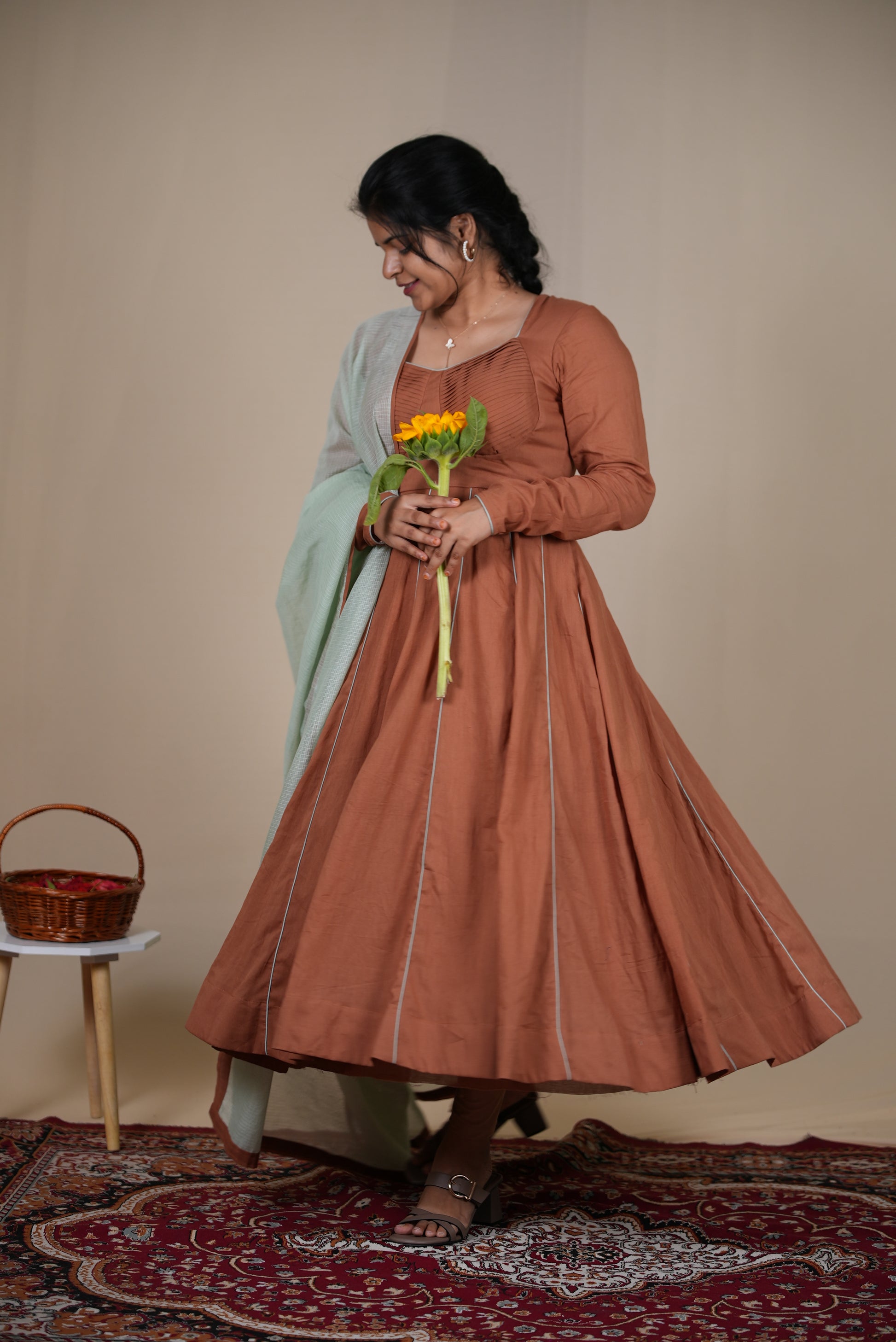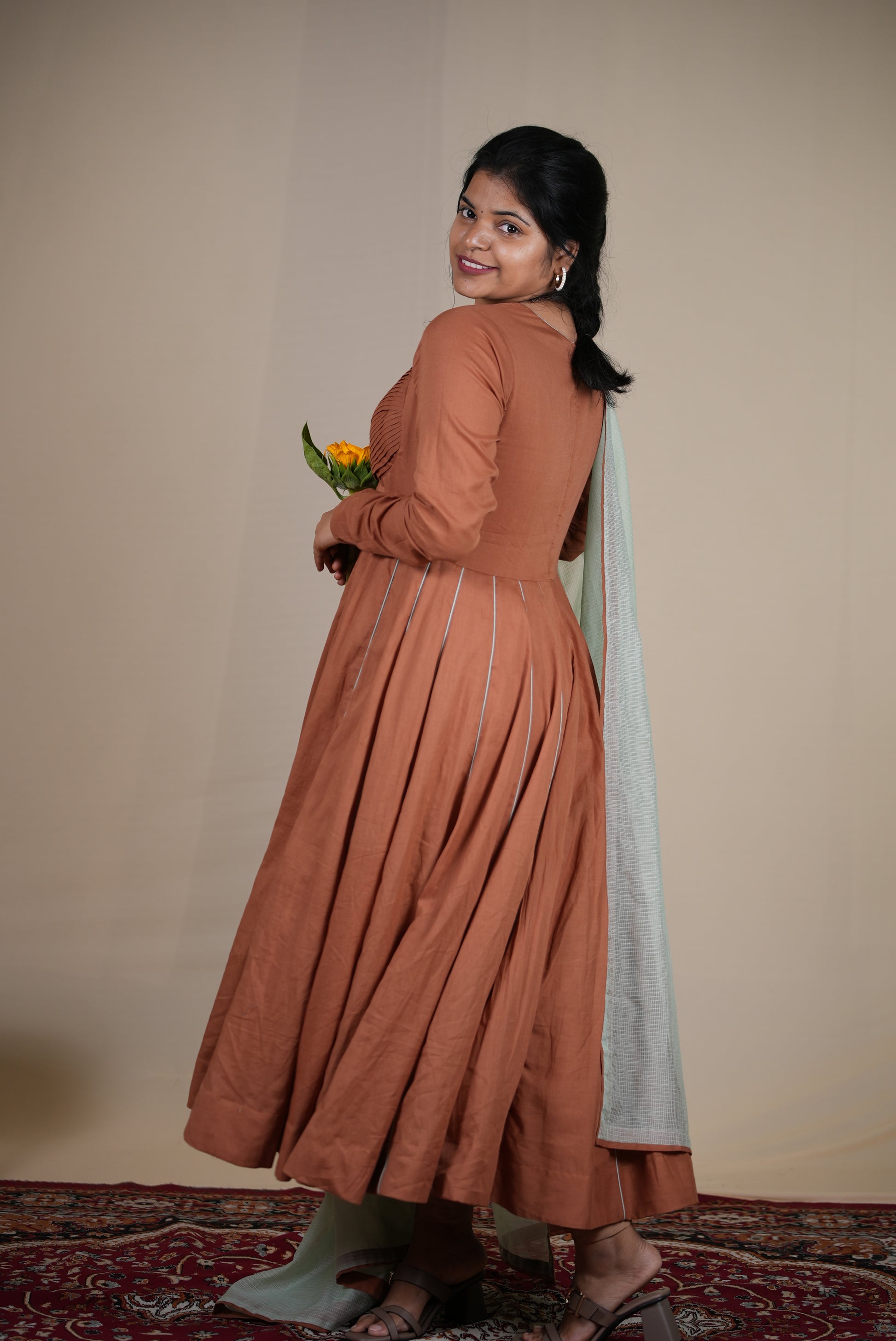 The terracotta brown shade gives a warm earthy feel, while the kali-cut silhouette ensures a graceful, flowy fall.