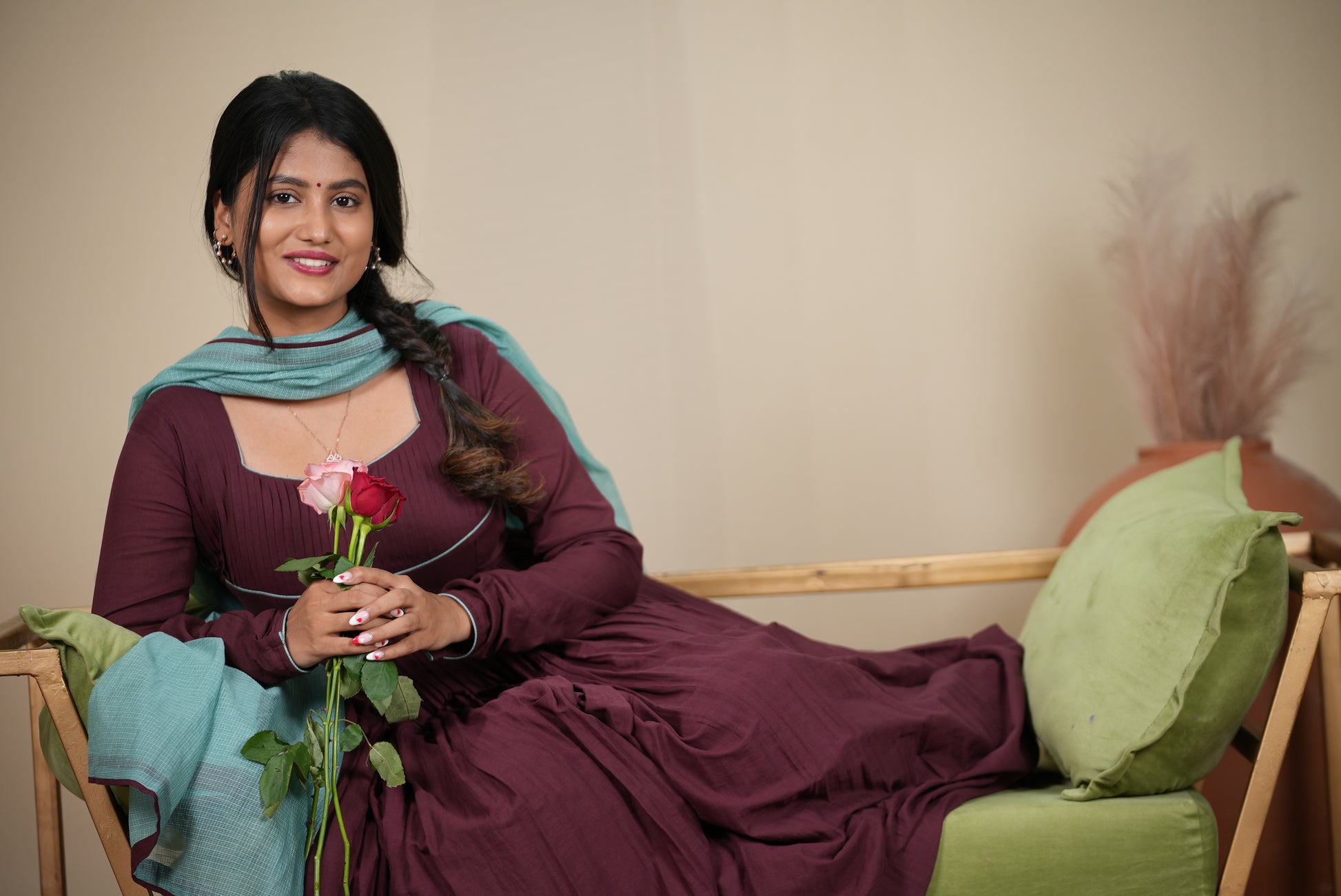 Its deep maroon colour gives a rich festive vibe, making it suitable for poojas, small celebrations, and family gatherings.
