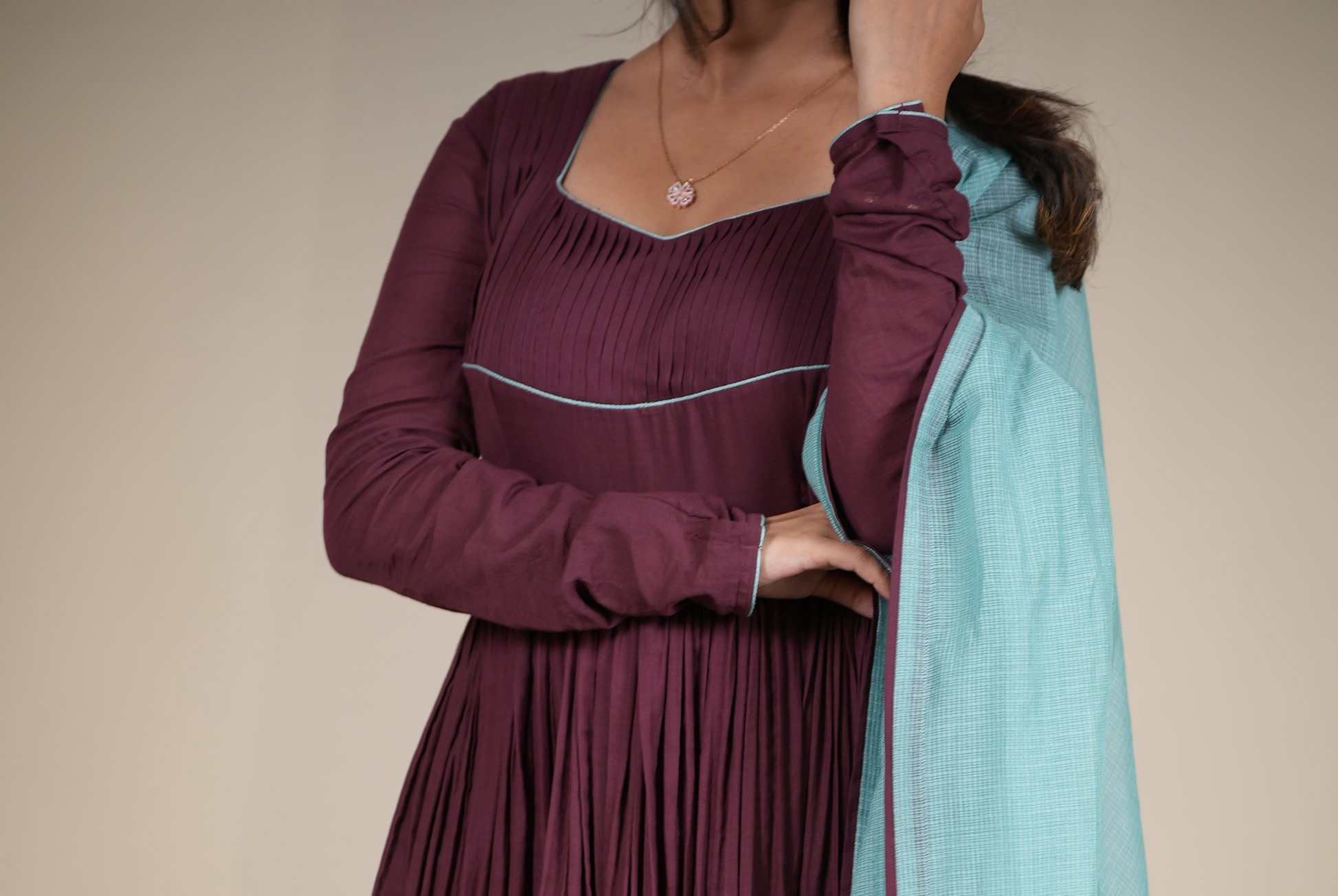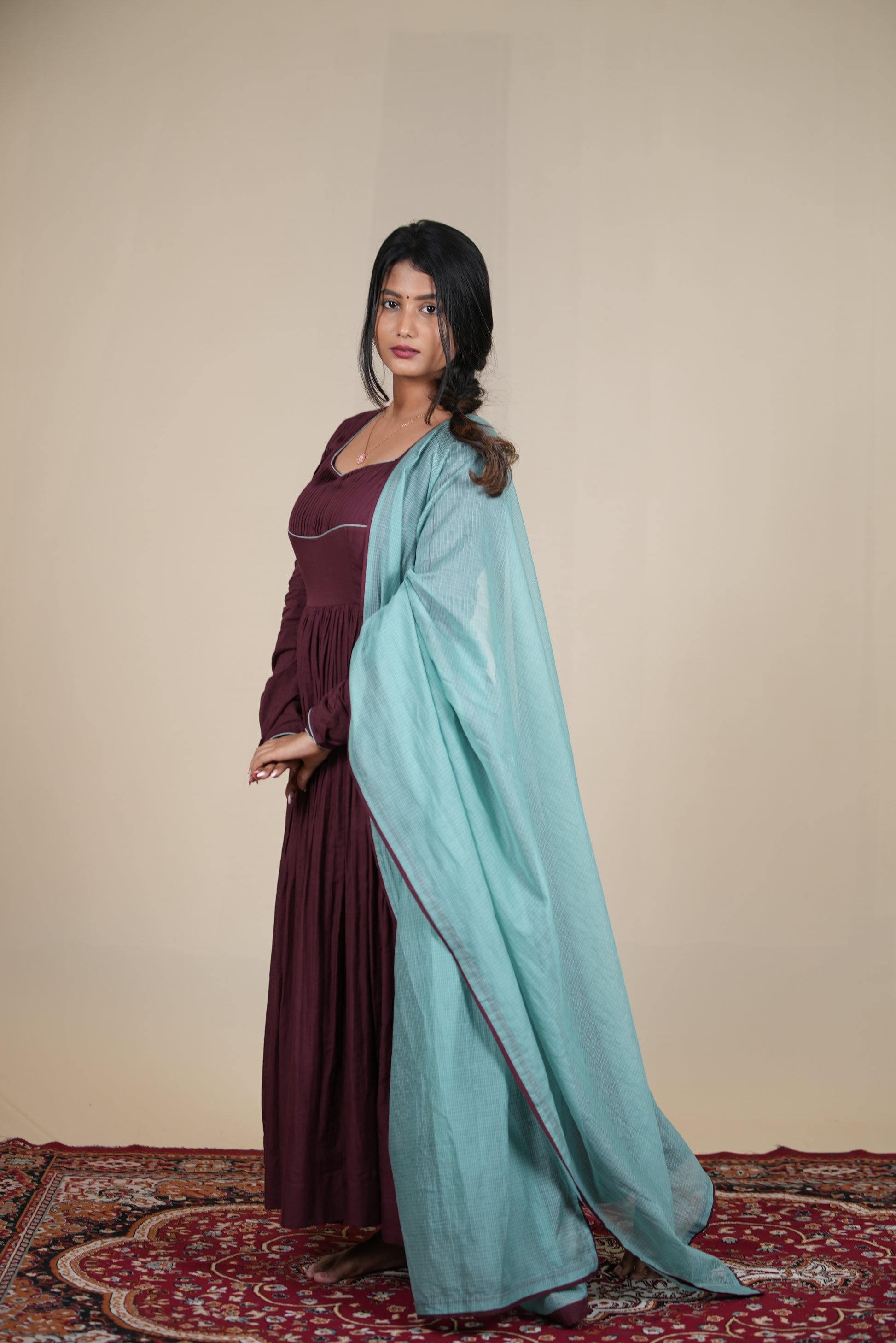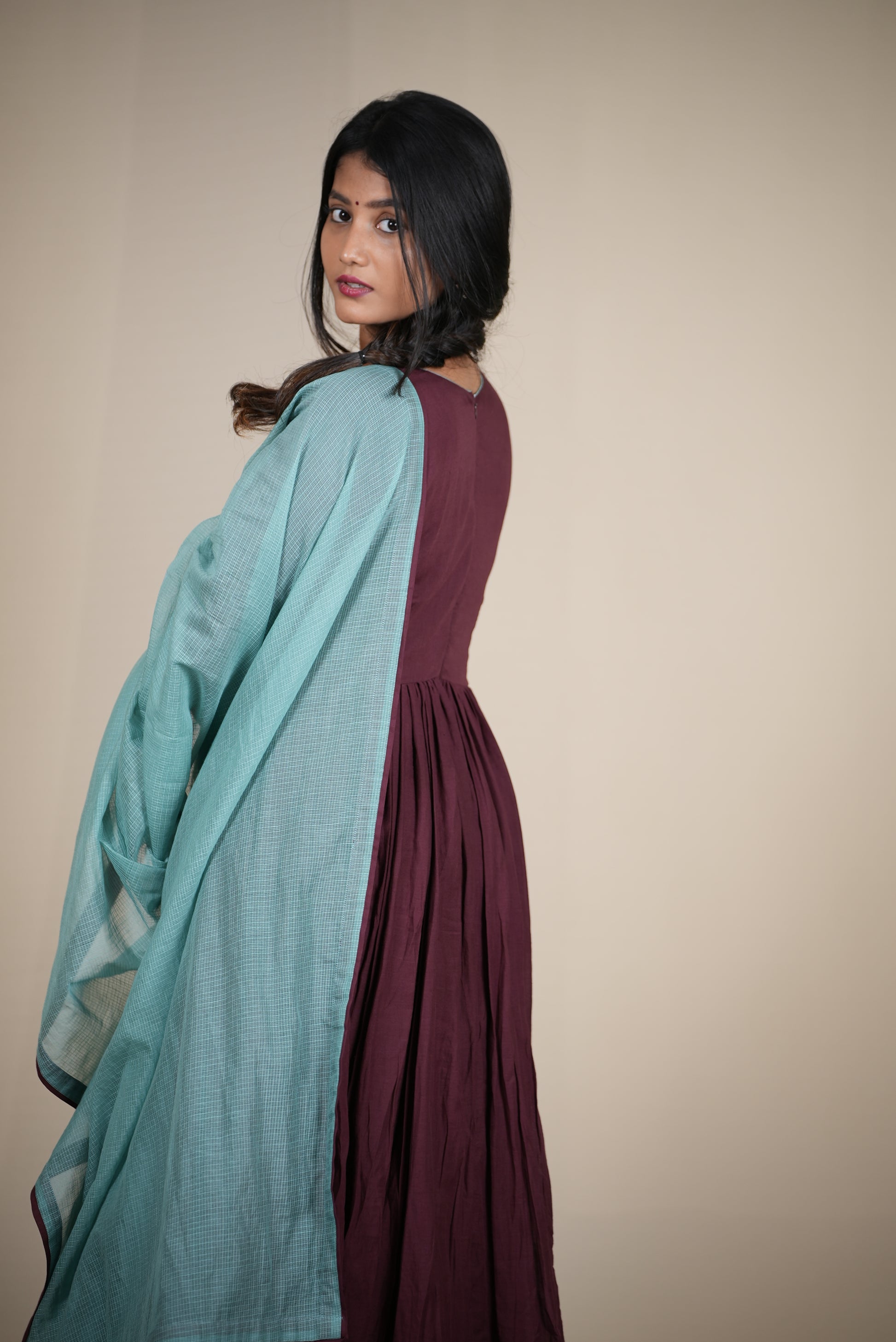 Paired with a dusty teal Kota Doria dupatta finished with a contrast border, the look stays classy without being heavy.