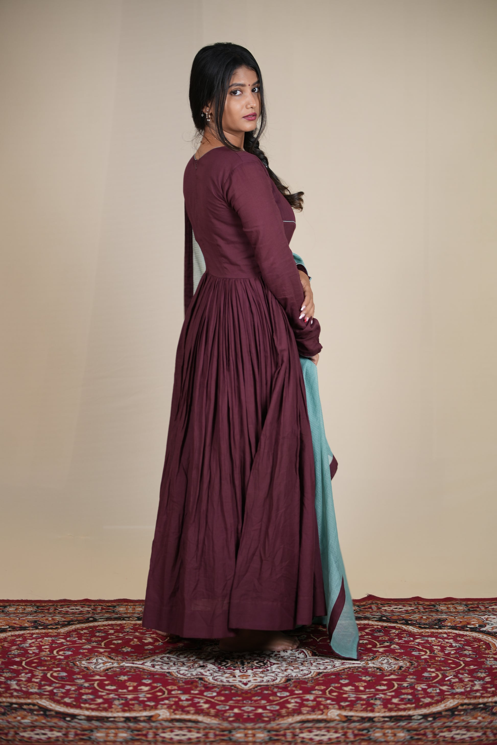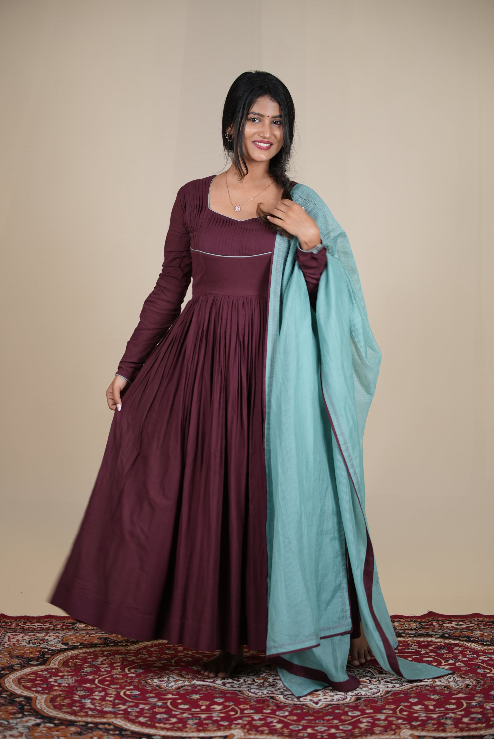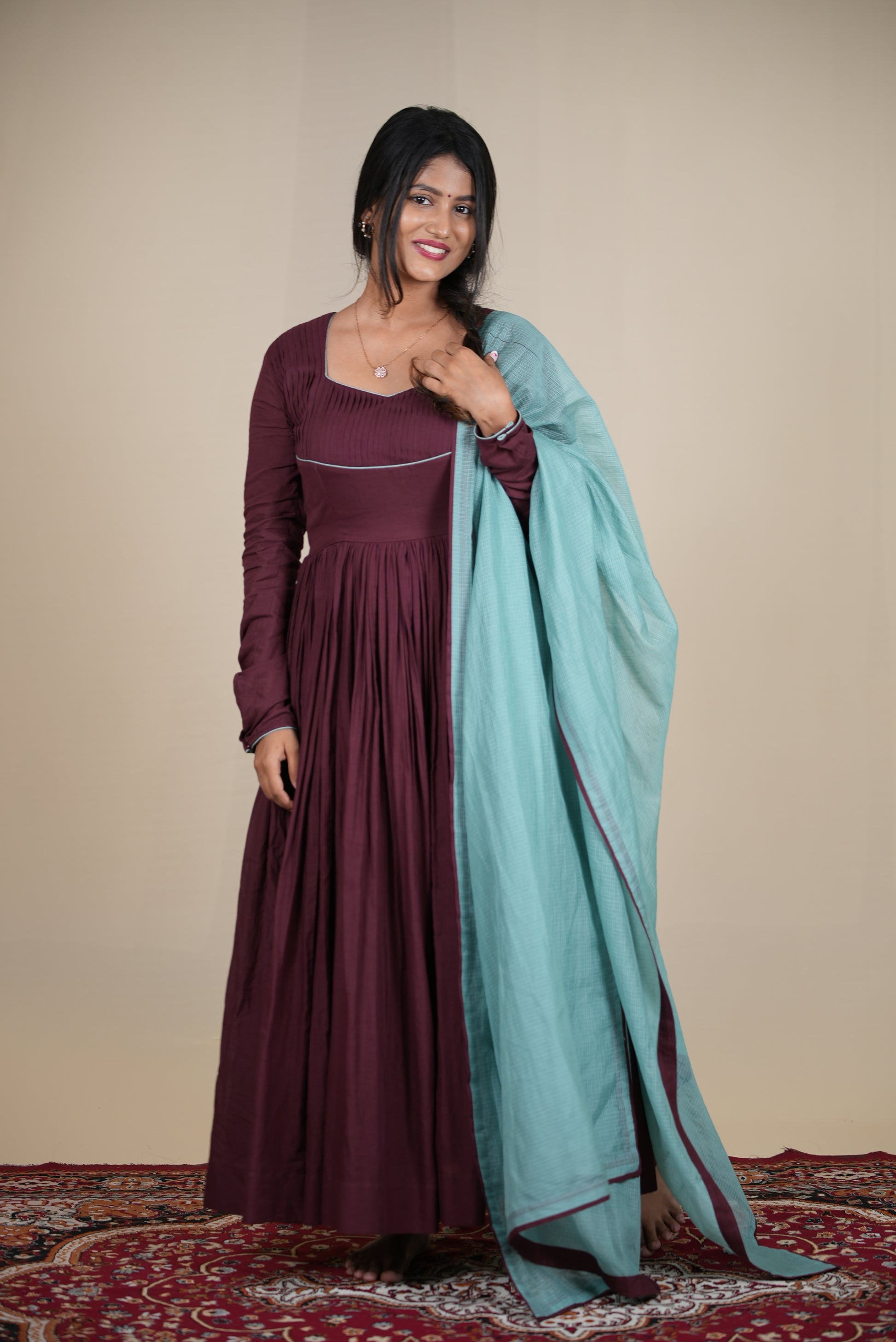 Paired with a dusty teal Kota Doria dupatta finished with a contrast border, the look stays classy without being heavy.